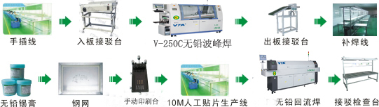 Artificial patch production line The artificial patch production line is mainly a manually simulated patch nozzle. The air pressure difference (reverse vacuum) generated by the manual patch pen itself is used to directly suck the patch component from the tape, and then the component is manually placed. In the corresponding PADS position, the artificial patch force is less than the sticking force of the solder paste (adhesive glue) through the adjusted air pressure suction, and the components are automatically placed on the corresponding PADS. |