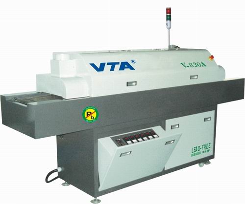 8.加熱系統(tǒng)采用高效節(jié)能的瑞典鎳烙發(fā)熱管,輻射功率峰值波長4UM,配合曲面反射罩,熱效率高,升溫度速度快,特制強制熱風(fēng)循環(huán)結(jié)構(gòu)系統(tǒng),使PCB及元器件受熱均勻,完全消除“陰影效應(yīng)”。